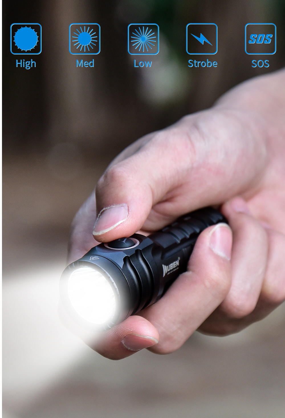 Яркость: максимум – 900LM, средний – 100LM, минимальный – 10LM, строб – 800LM, SOS – 100LM.