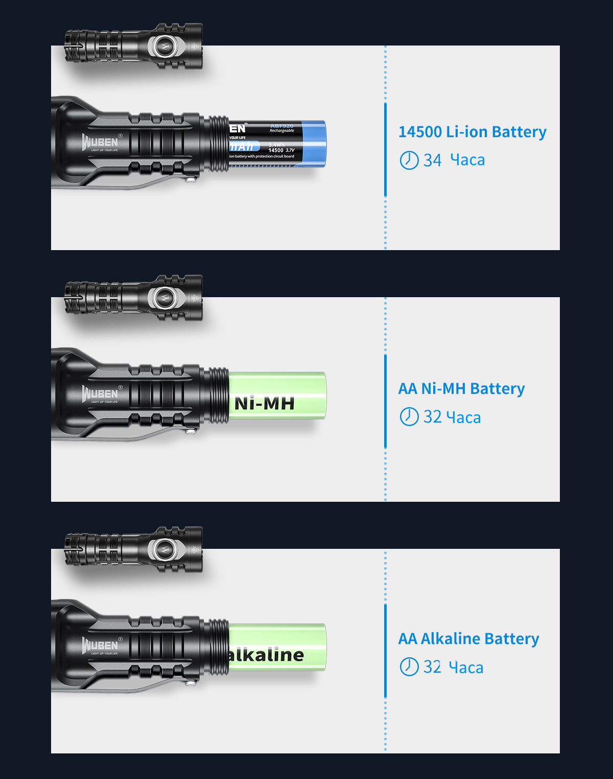 Аккумулятор: 1 X 14500 Li-ion (920mAh) либо АА Ni-MH.