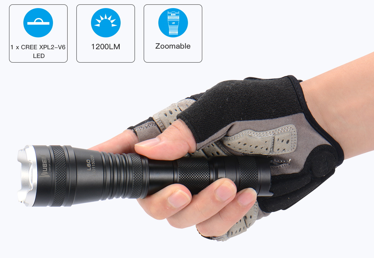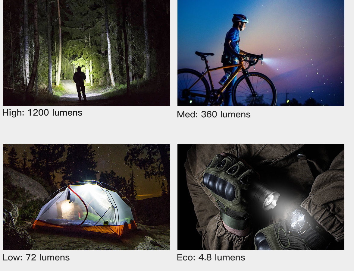 5 режимов: максимальный – 1200 люмен, средний – 400 люмен, минимальный – 75 люмен, эко – 5 люмен и SOS. Фонарик может работать около 220 часов в экономичном режиме.