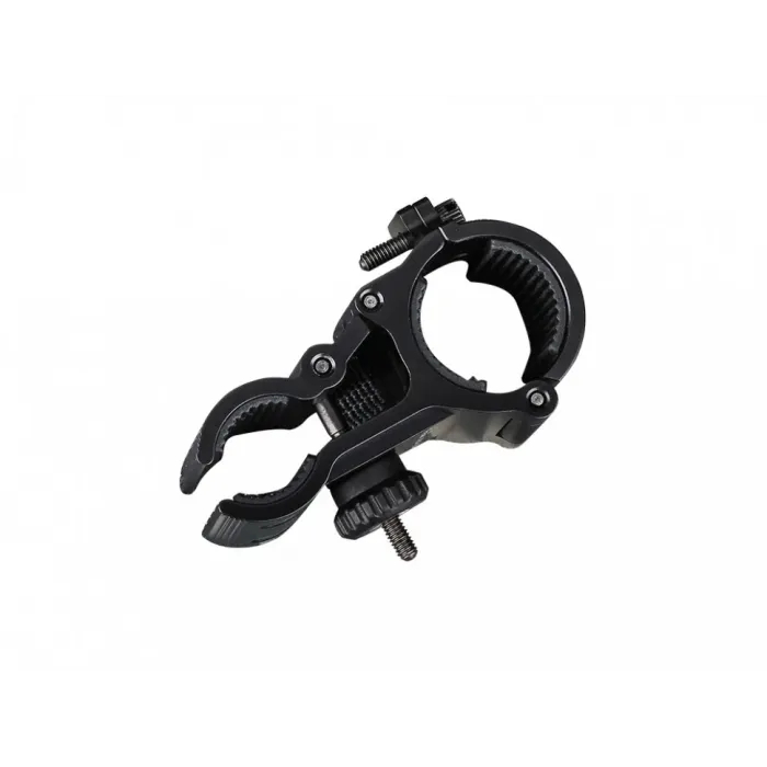 Крепление оснащено зажимом с ручным винтом с ребристой поверхностью, что позволяет легко и надежно зафиксировать фонарь без использования дополнительных инструментов. Резиновые вставки внутри зажима обеспечивают виброустойчивость и предотвращают повреждение поверхности фонаря и оружия.