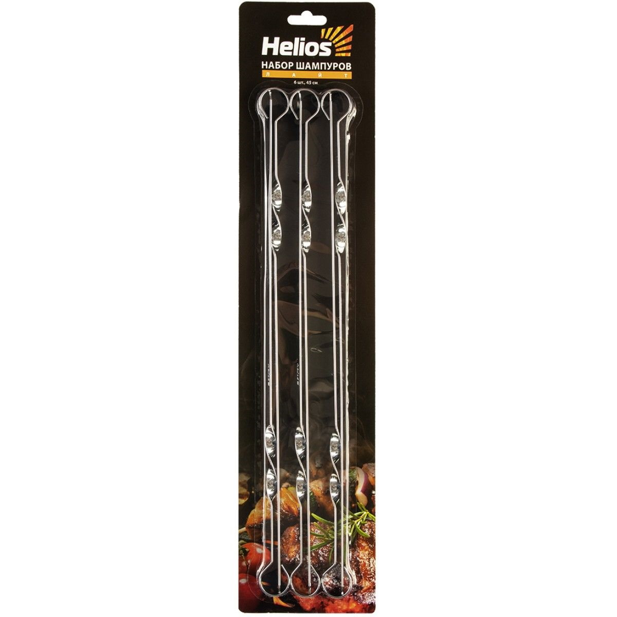 Набор из 6 плоских шампуров из хромированного металла для приготовления шашлыков из мяса, птицы, овощей. Упаковка - блистер.