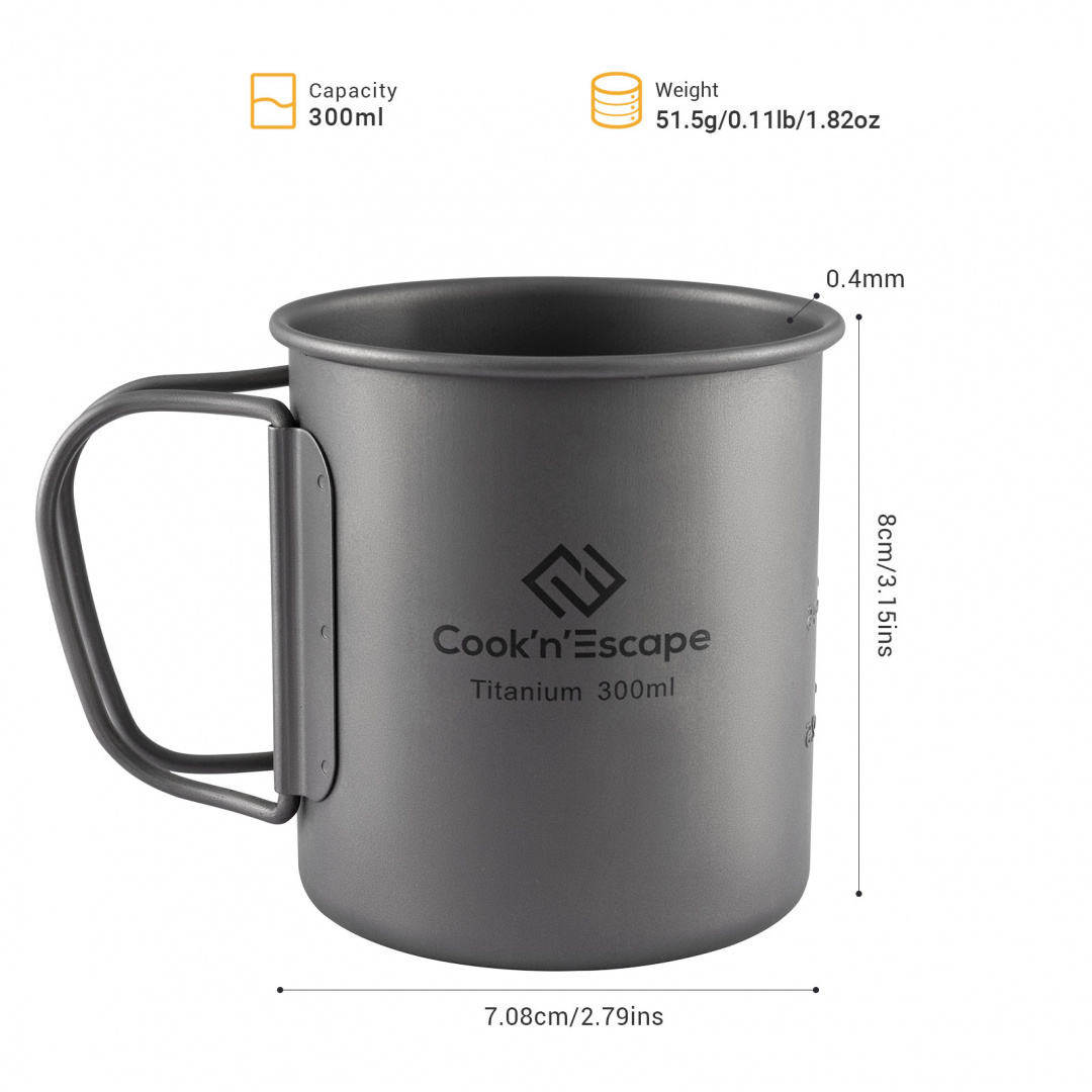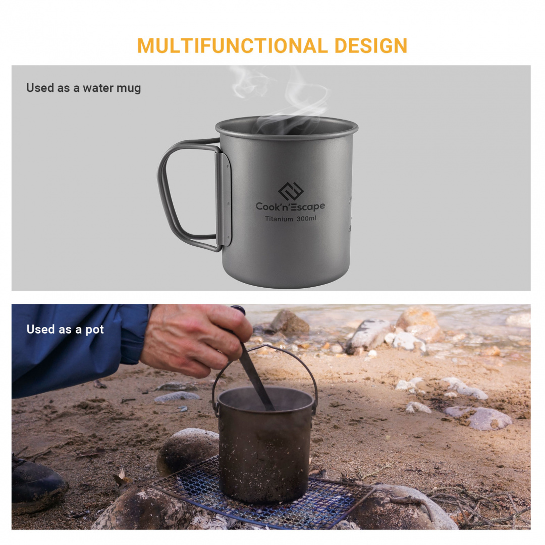 Универсальная титановая кружка может использоваться как небольшой чайник для кипячения, чашка для чая, кофейная кружка, кружка для воды, емкость для подогрева или контейнер для предметов первой необходимости. Можно также использовать в качестве мерного стаканчика!