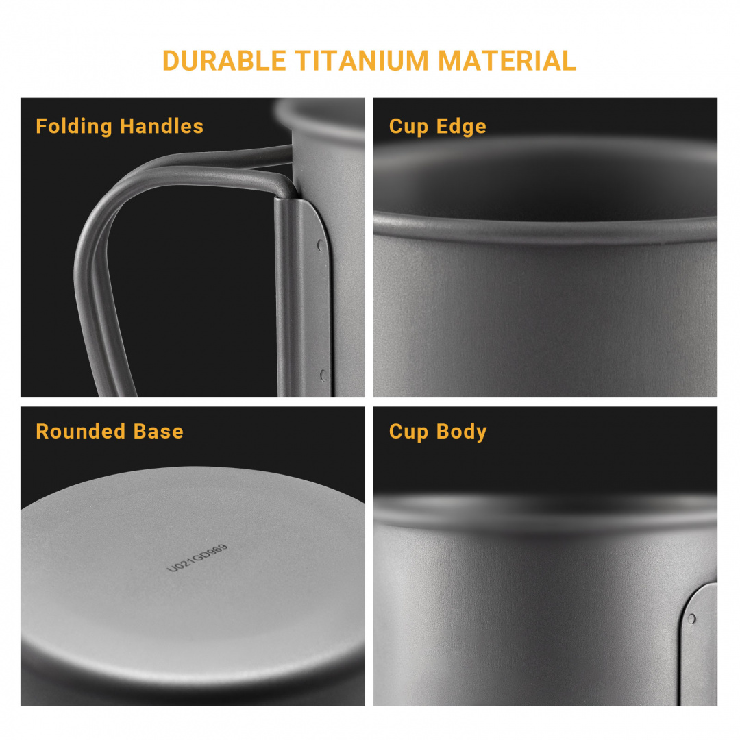 Универсальная титановая кружка с крышкой может использоваться как небольшой чайник для кипячения, чашка для чая, кофейная кружка, кружка для воды, емкость для подогрева или контейнер для предметов первой необходимости. Можно также использовать в качестве мерного стаканчика!
