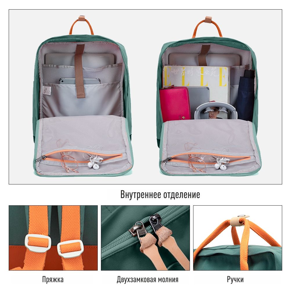 Большой внутренний объем, множество карманов внутри для различных гаджетов и всякой полезной мелочовки. Фронтальный карман на молнии и большие боковые карманы. Ручки для переноски, регулируемые плечевые ремни.