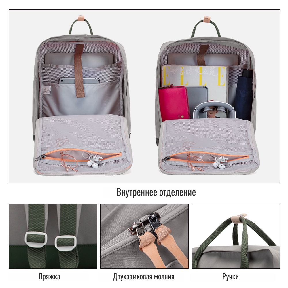 Большой внутренний объем, множество карманов внутри для различных гаджетов и всякой полезной мелочовки. Фронтальный карман на молнии и большие боковые карманы. Ручки для переноски, регулируемые плечевые ремни.
