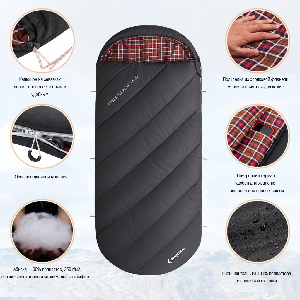 Фланелевая подкладка обеспечивает мягкость и уют, а утягивающийся капюшон с внутренним воротником помогают сохранить тепло, создавая комфортные условия для сна. Прочное водоотталкивающее покрытие защищает от сырости и небольших осадков, а компрессионный мешок делает транспортировку удобной, особенно для тех, кто отправляется в длительные поездки.