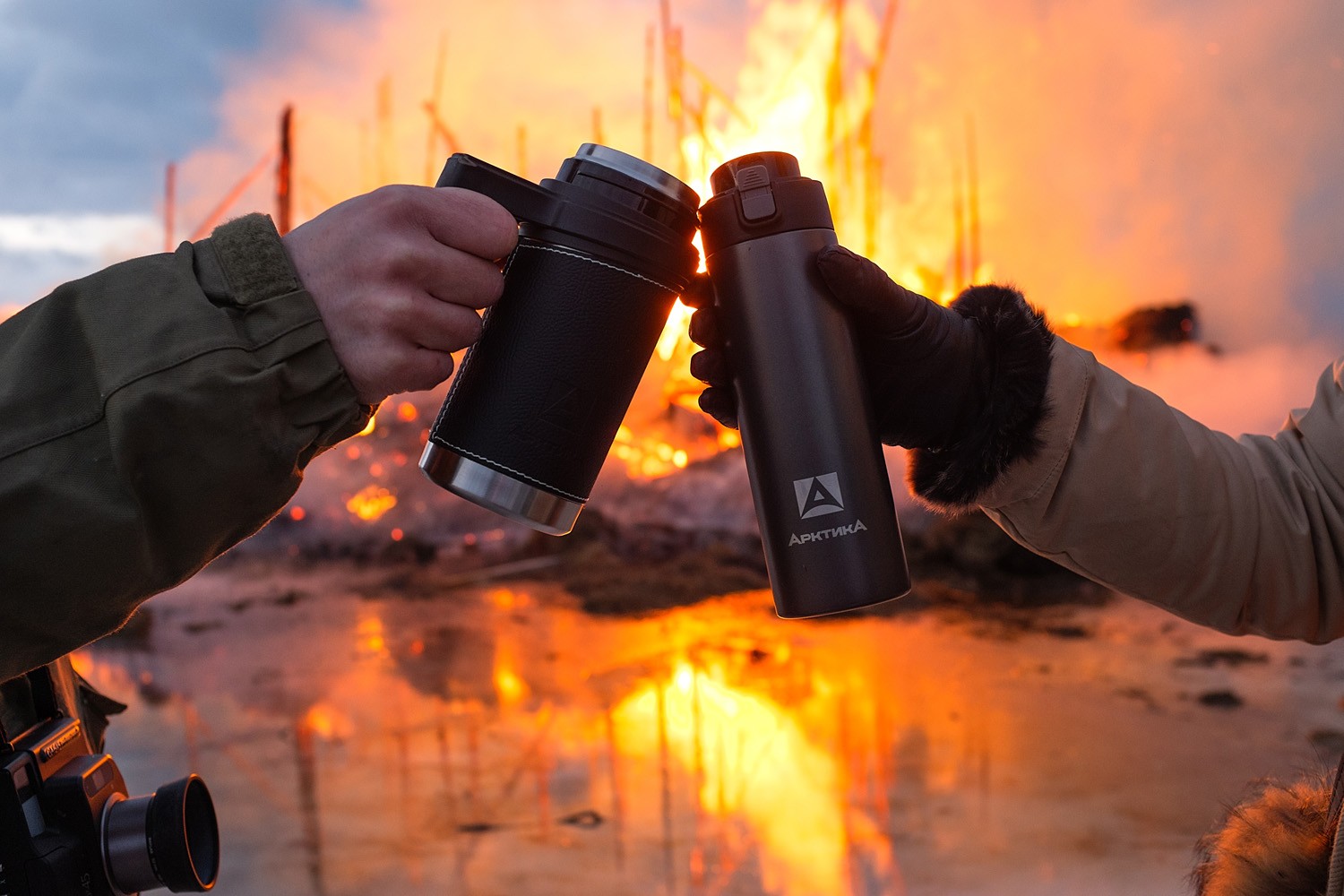 Термокружку очень приятно держать в руке благодаря удобной широкой ручке. На кружке есть накладка из кожзаменителя, которая с лёгкостью снимается для мытья и сушки, также она не позволяет на морозе стенкам термокружки примёрзнуть к рукам.