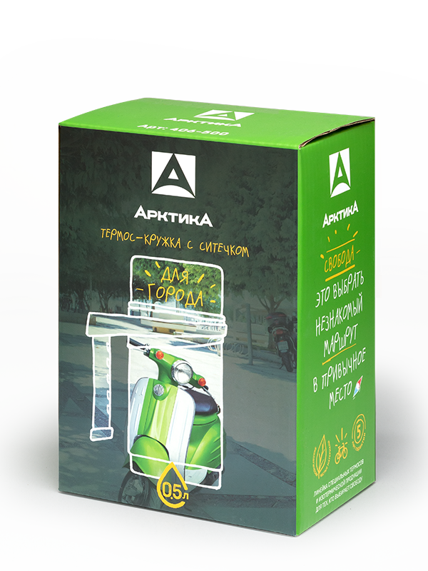 Термокружка из нержавеющей стали объёмом 500 мл с накладкой из кожзаменителя. Колба изготовлена из пищевой нержавеющей стали. Глухая крышка на резьбе. Боковая ручка. Металлическое сито под крышкой.
