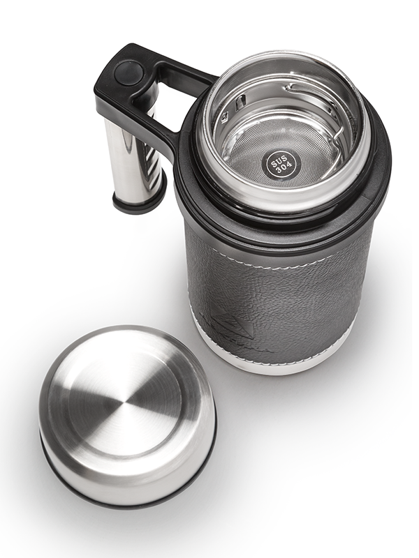 Горло термокружки имеет большой диаметр, что позволяет с лёгкостью заливать любой напиток и класть кусочки льда. Крышка с силиконовым уплотнителем плотно сидит в горле, герметично закрывая содержимое. Под крышкой вставляется металлическое сито для заваривания чая.
