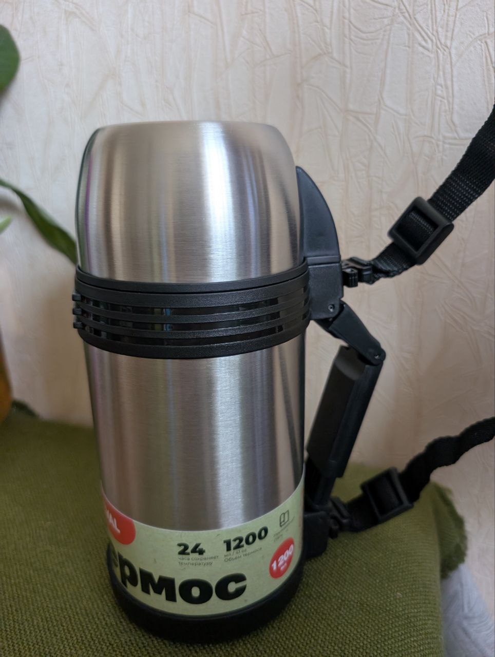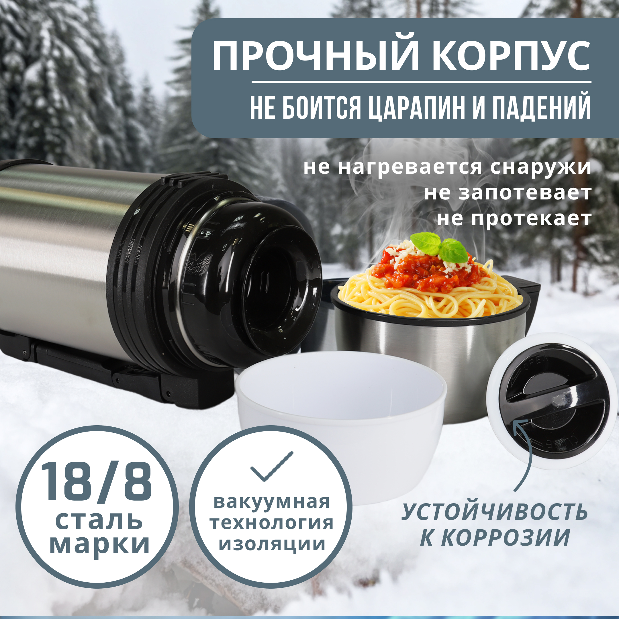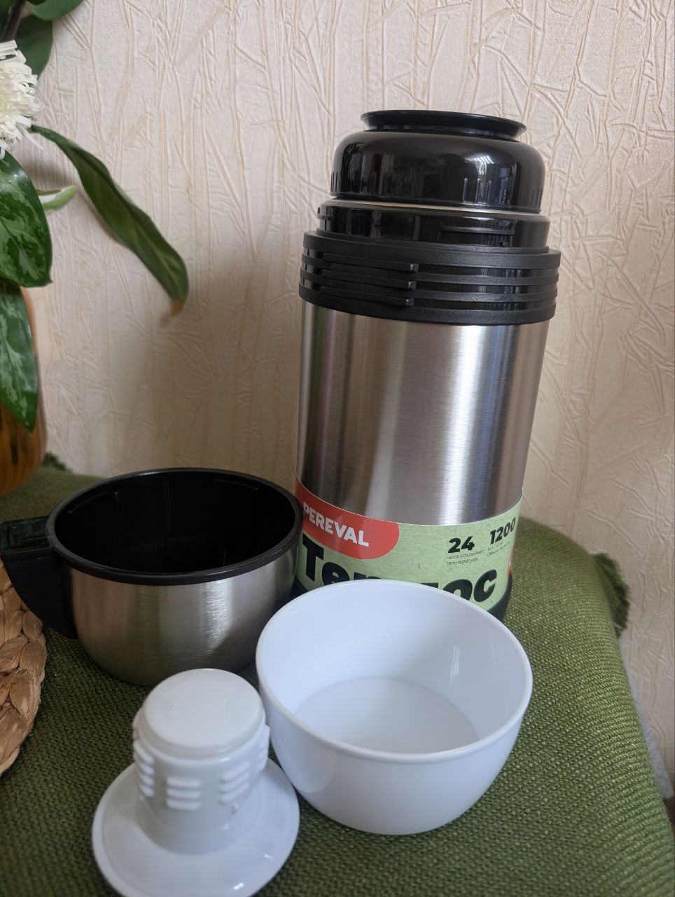 Широкое горлышко термоса облегчает наполнение и очистку, что делает его удобным в использовании. Две крышки, обеспечивающие надежность использования термоса, одна из которых может использоваться как чашка или тарелка.