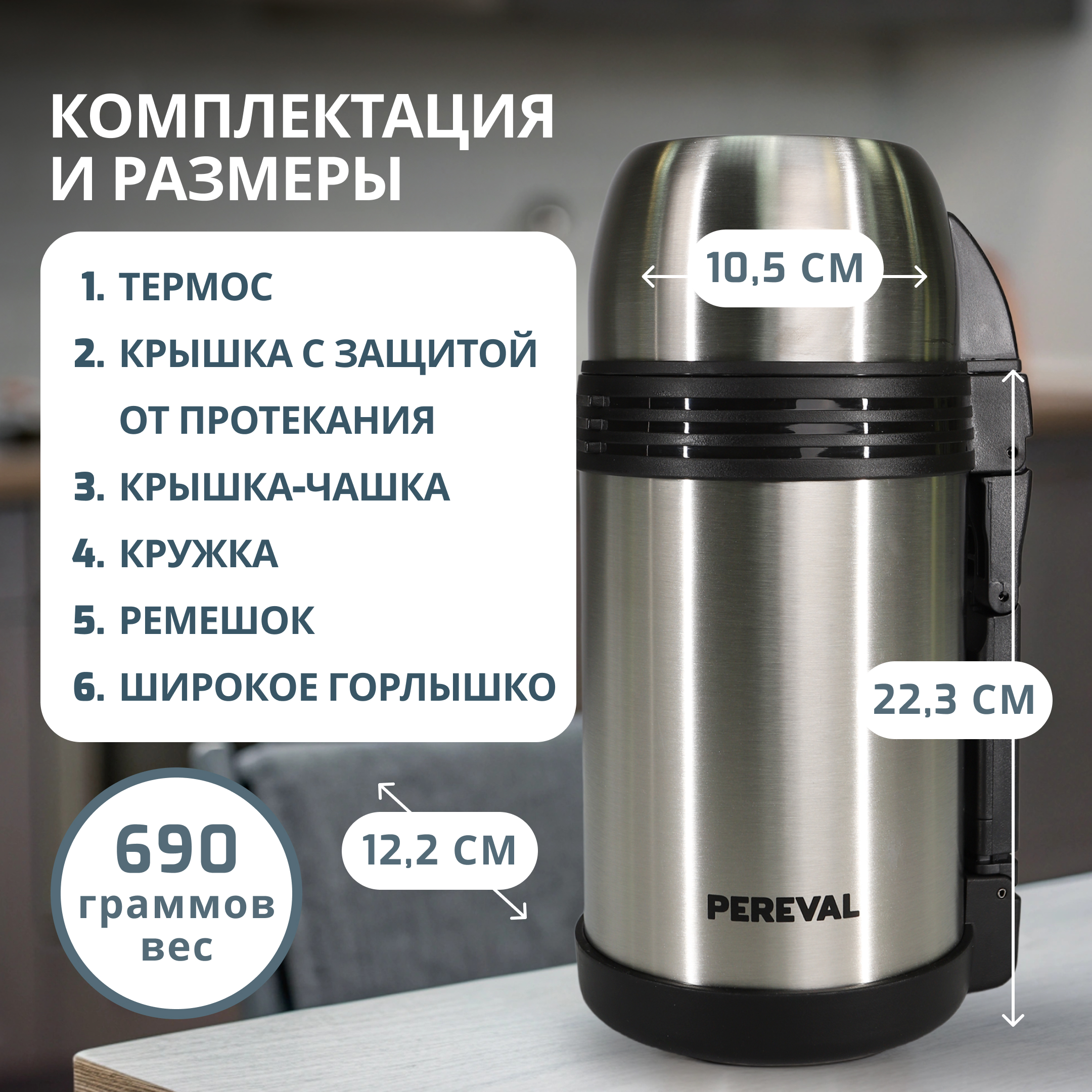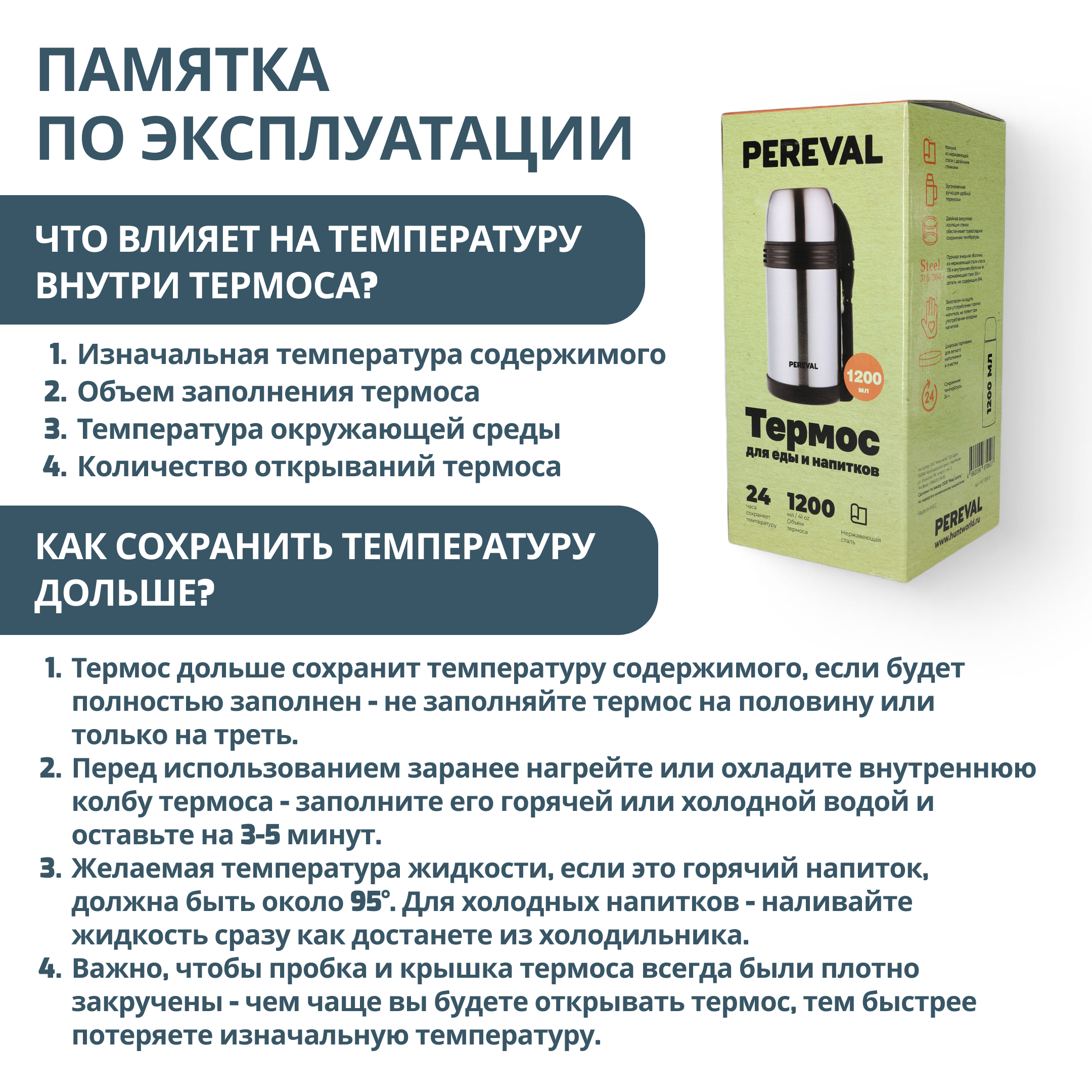 Термос Pereval сохраняет температуру до 24 часов. Однако, учитывайте, что срок сохранения температуры в термосе зависит от условий эксплуатации, при частом открывании температура будет снижаться быстрее.Информация о технических характеристиках, комплекте поставки, стране изготовления и внешнем виде товара носит справочный характер и основывается на последних доступных сведениях от производителя. Фактическое наличие, комплектация, внешний вид и состояние товара проверяется и подтверждается после оформления заказа, до момента отгрузки.